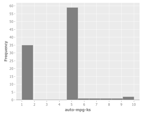 10 1 :farthest-first 100 auto-mpg-pca-bootstrap [0.05 0.95])None of these give us the k=8 spike that Sugar & James got. Instead, we see evidence for k=5, or the possibility that k=1 or that the found clusters are weakly grouped.