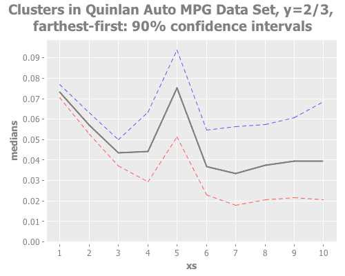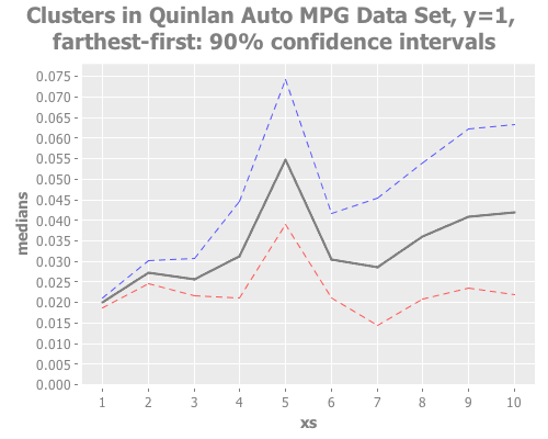 10 1 :farthest-first 100 wbcd-bootstrap [0.05 0.95])I am not sure what configuration differences cause such disparity between the choices of y I find useful and the ones Sugar & James do. Regardless, given what we know about selecting y, 1>y>4 is a reasonable range to use, and in the end our results are not too different.