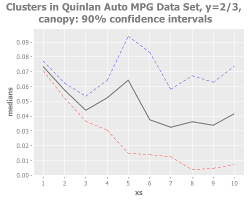 10 (/ 2 3) :canopy 100 auto-mpg-pca-bootstrap [0.05 0.95])(graph-bootstrapped-jumps "Quinlan Auto MPG Data Set, y=1, canopy"