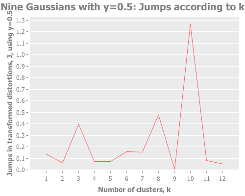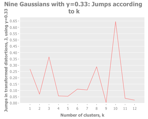 (graph-k-analysis nine-gaussians "Nine Gaussians" 12 1 :farthest-first [:jumps])Now that's what I'm talking about. Once initialized properly, the jump method nails it for the "three clusters of three" curveball. It even picks up the secondary spike at k=3, though it does that better at slightly lower y values: