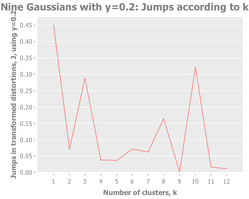 OK. Whew! What have we learned trying to find clusters in the nine-points curveball of a data set? Initial centroid placement is important. Some methods for it rely on random seeding, which you in those cases need to take into account. Sometimes, some initialization methods crash and burn with a given data set, or only one will excel at a given data set. Yet, often, all four used here will perform similarly. When something goes wrong it can help to see its failure mode visually. Getting a feel for analysis of random distributions requires multiple runs. The jump method is often more insightful than the elbow method, especially when sub-grouping is present. Comparing magnitudes of jumps between separate runs is just like comparing magnitudes within the same run: it points you to the more convincing peaks in the jump graph.