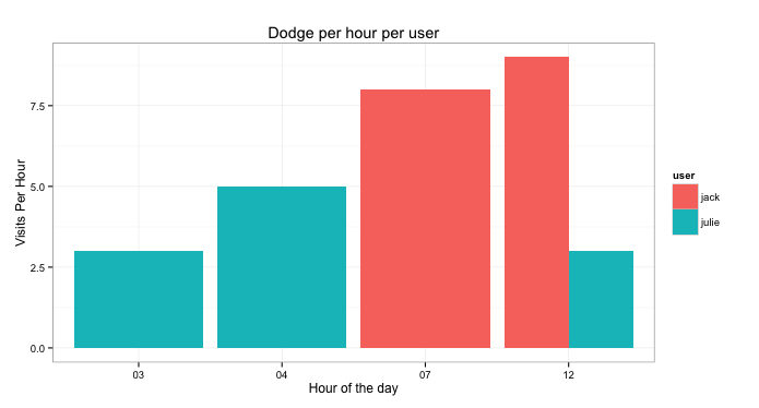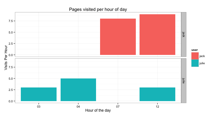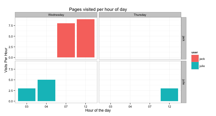 theme_bw()From that we can now see that Julie is the only one that visited pages between 3am and 4am. On the other hand, at 7am, only Jack used the site. At 12pm, both users used the site but Jack used it more.