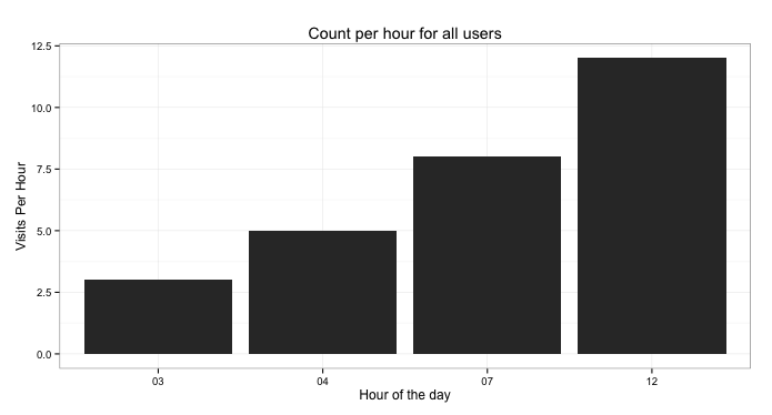byHour <- ddply(data, .(user, hour), summarise, countPerHour=sum(pages.visited))We now have a new data.frame byHour which contains the sum of visited page per hour per user.