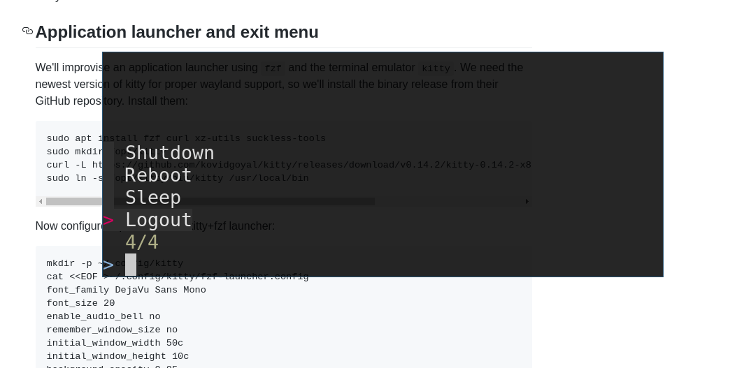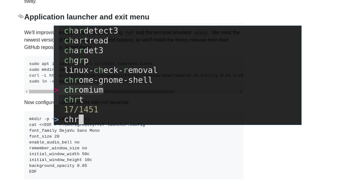 We'll improvise an application launcher using fzf and the terminal emulator kitty, it'll look like this: