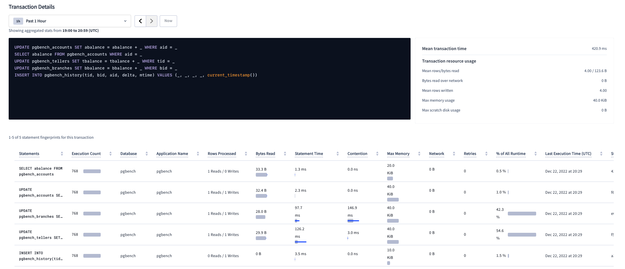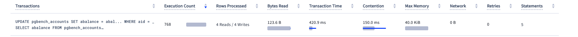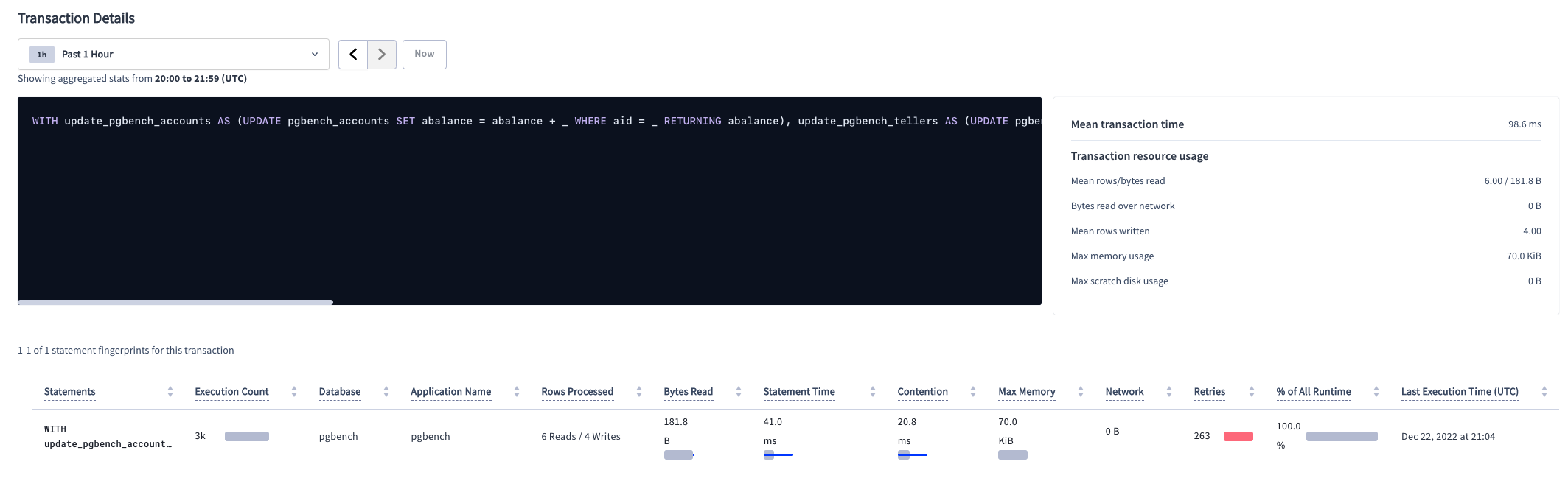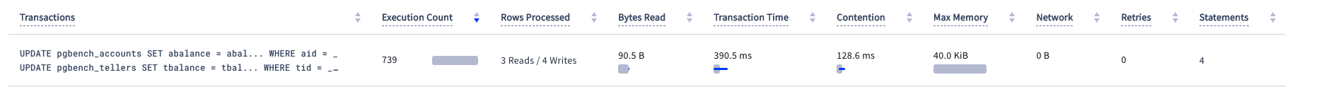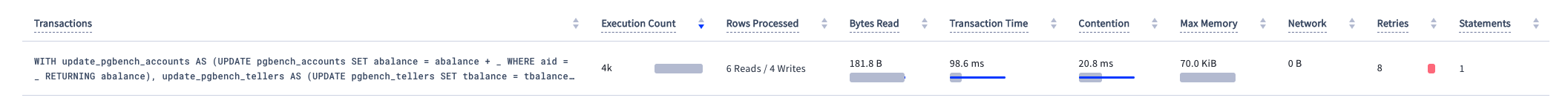 SELECT abalance FROM update_pgbench_accounts;You may ask why did I not include the BEGIN and END? The reason being CockroachDB operates in serializable isolation and each statement is executed as if it had exclusive access to the cluster. There is no need to treat this transaction explicitly and furthermore, converting it to an implicit transaction allows CockroachDB to retry it server-side. I don't even need to pass the --max-tries flag as Cockroach will handle them.