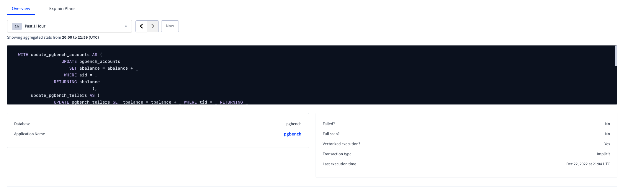 31.515 0 END;TPS is 4.5. Notice the per statement latencies reported. Let's look at the same query without select