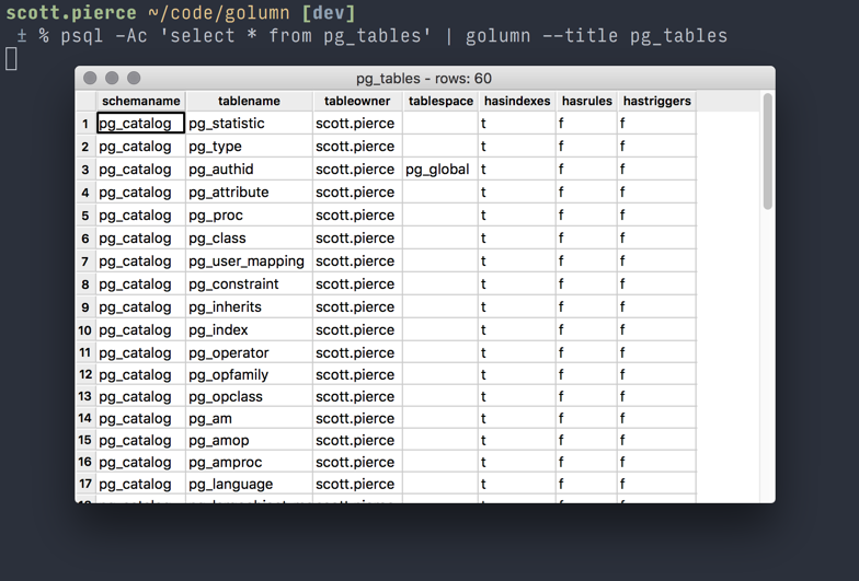 | psql -Ac 'select * from pg_tables' | golumn --title pg_tables |