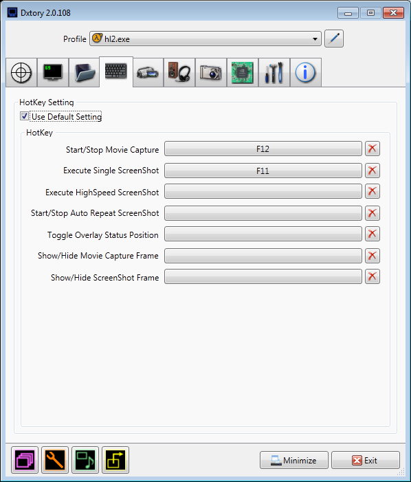 The only hotkey that matters for stremaing is the Start/Stop Movie Capture which, by default, is set to F12. This will not start/stop your stream but it will toggle the feed of your game to the Dxtory camera that Xsplit uses. This will make a bit more sense later in the guide...