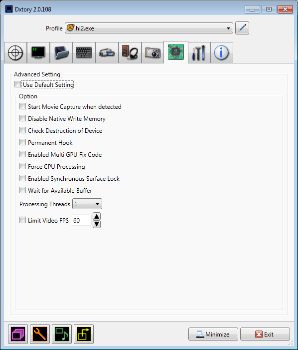In this tab, these are the settings I use. The important settings here is to make sure "Limit Video FPS" is UNCHECKED. This will lock your frame rate in TF2 to a maximum of 60fps. Some people have experienced better results with Dxtory by raising the Processing Threads but it didn't make a difference for me so I left it at 1.