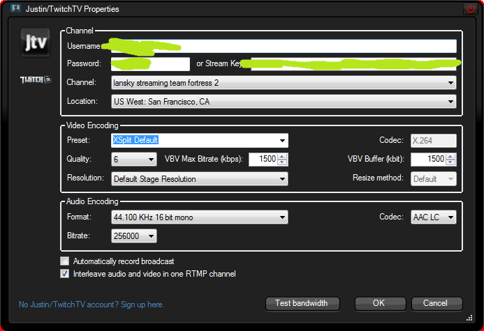 Before you start streaming you need to choose a site to stream to. The major sites for gaming are own3d.tv and twitch.tv and I personally recommend twitch.tv (most TF2 players use it, but you can do whatever you want). Just go to either site and register and create your channel. Both sites will give you a stream key, which is a code that you can use in XSplit or FMLE to stream to your channel. However, XSplit specifically allows you to just login to your account and it will handle that for you.