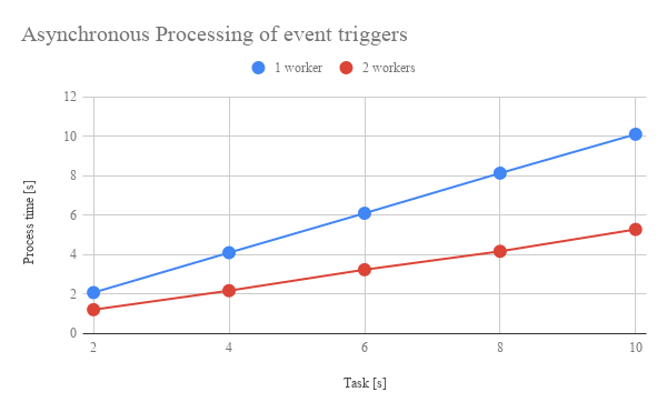Figure 1 shows the result of task vs. process time. Blue and red dots mean 1 worker and 2 workers, respectively. For 1 worker, the sample script is here. For 2 workers, the sample script is mentioned above. From Fig. 1, it is found that the result of 1 worker coincides with the time of task. On the other hand, it was also found that for 2 workers, the result of it is half of the time of task. From this result, it is found that the script for 2 workers works as the asynchronous process, and also the task can be shared by the workers. This result indicates the asynchronous process can be achieved by using the event triggers and the simple script.
