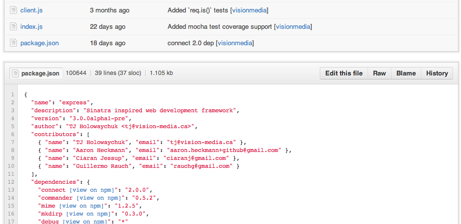dotjs userscript for visualizing package.json files (if present) underneath the tree view. Now with links to NPM for dependencies!