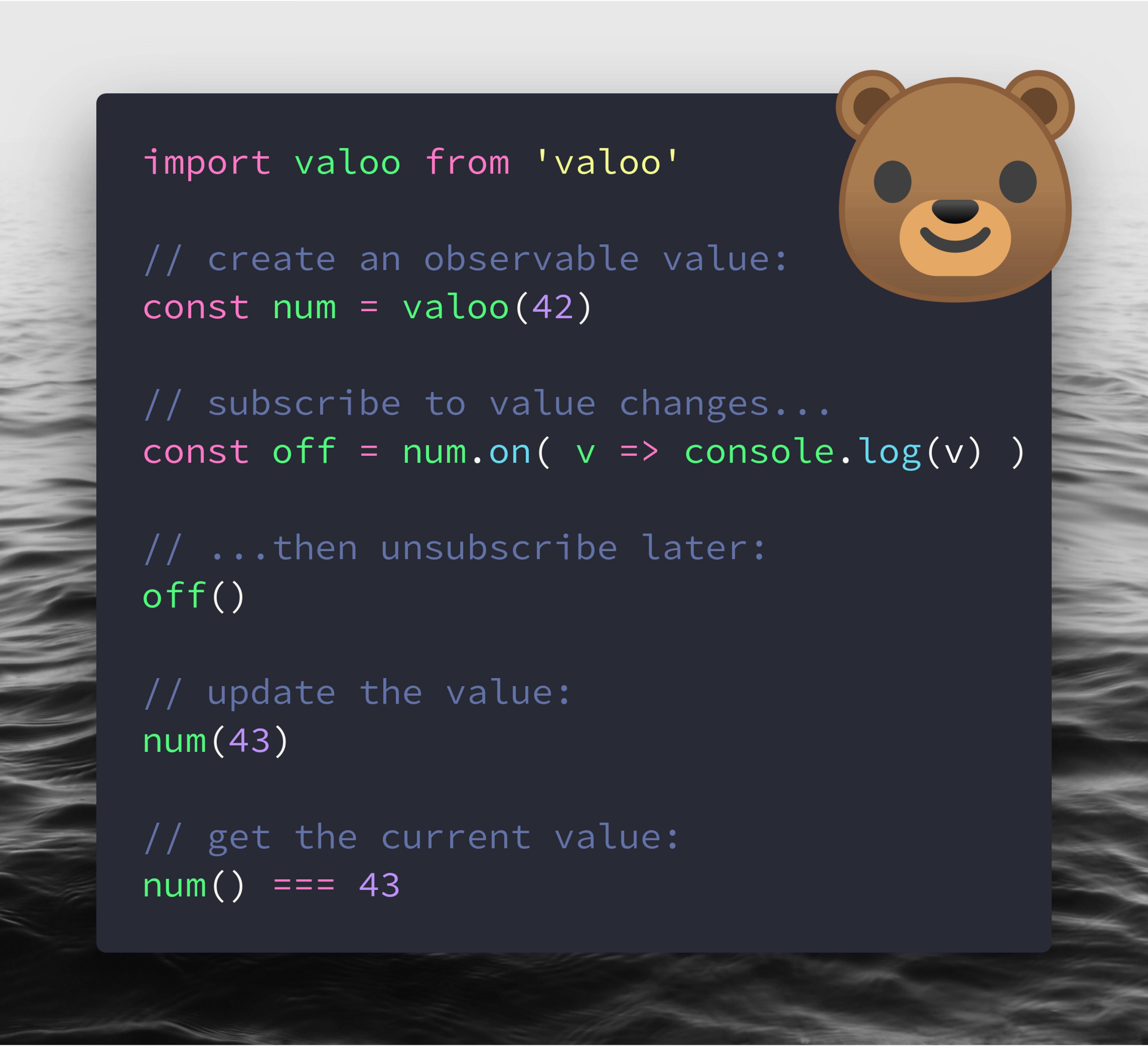 num() // 43valoo-lite.mjs: lighter 120b version, but doesn't support unsubscribing.valoo-original.mjs: v1-compatible, with subscribe handled via overloading.