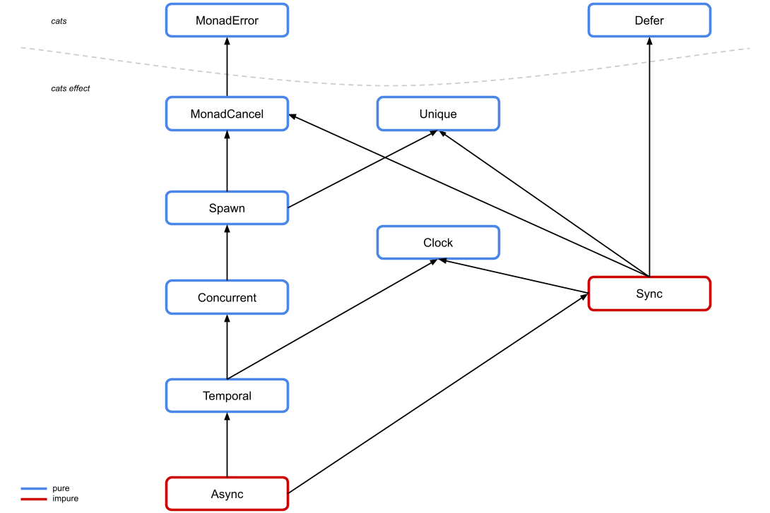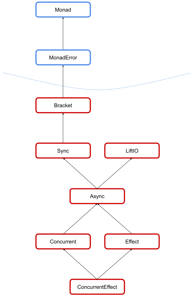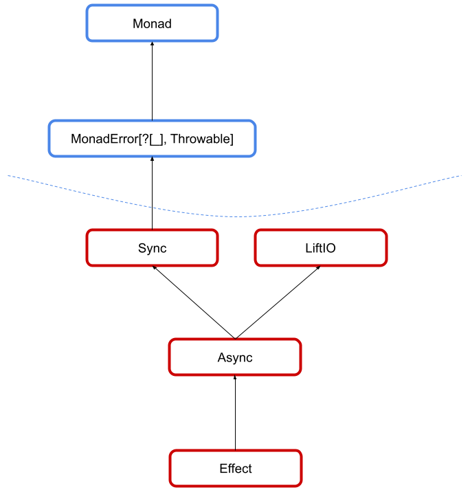 Temporal(and above) are all generic in their error type,E, similar toMonadError. This is becauseThrowableis forced by the JVM when capturing side-effects, butTemporaland above are all pure and thus need not special-case a specific error type! Asyncis now the second-most powerful typeclass in the whole hierarchy. If you have anAsync, you can do almost anything. Note thatAsyncis still inhabited by types which are not isomorphic toIOthough, such asOptionT[IO, ?]Syncis split away from the rest of the hierarchy, and it's the only typeclass other thanConcurrentwhich loses power in the new system. Specifically, if you have aSyncand only aSync, you do not automatically get resource management (viabracket). Due to subtype encoding of typeclasses, it is somewhat difficult to resolve this limitation, and I have never seen a use-case in the wild where someone neededbracketanddelayand nothing else.Effect(and friends) represent an isomorphism withIO(and equivalent). In other words, any type which forms anEffectmust be exactly as powerful asIO, while any type which forms aManagedmust be exactly as powerful asResource[IO, ?]. Analogously forSyncEffect(equivalent toSyncIO) andSyncManaged. These names are awful.LiftIOis gone, and the hierarchy does not special-caseIOat any point