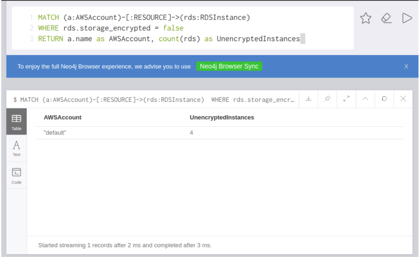 RETURN a.name as AWSAccount, count(rds) as UnencryptedInstances