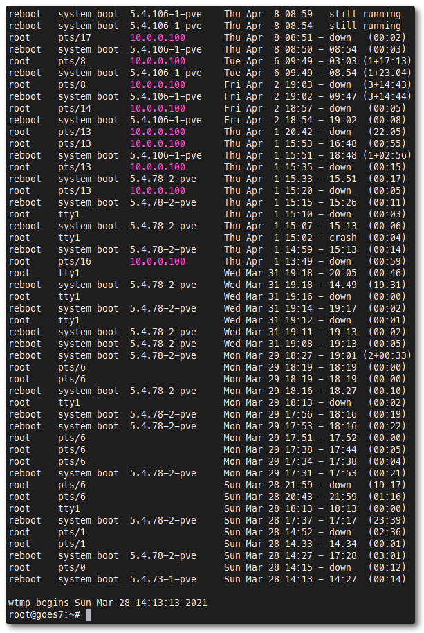 whoNow, to compare, a list of all the logins, reboots, etc on the box.