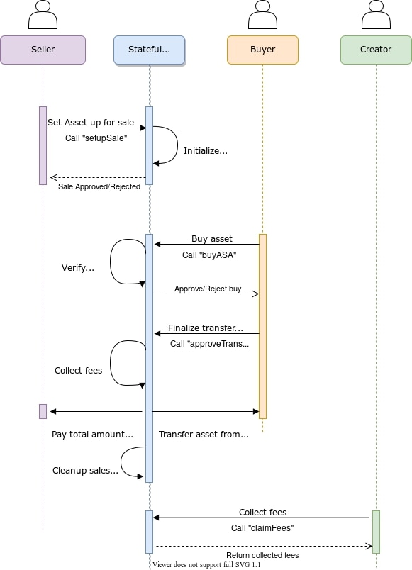 setupSaleCan be called by any user, and it is used to set up a new sale.buyASAAny user that wants to buy the asset needs to call this method first.executeTransferAfter paying, the buyer can finalize by transfering the asset to his/her wallet. Alternatively, the user can get the money back by calling therefund methodrefundThis method can be used by the buyer to get the money backclaimFeesThis method can only be called by the creator of the asset to collect royalty fees