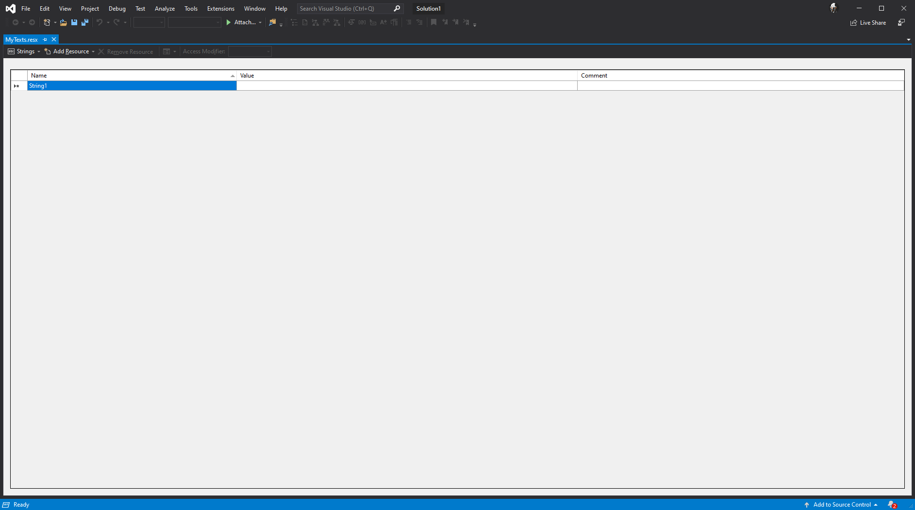 <DisplayName>{LOC:My_Cool_String}</DisplayName>Now add that same string to the Name-column in the MyTexts.resx-file. Place the text you want to show ingame into the Value-column: