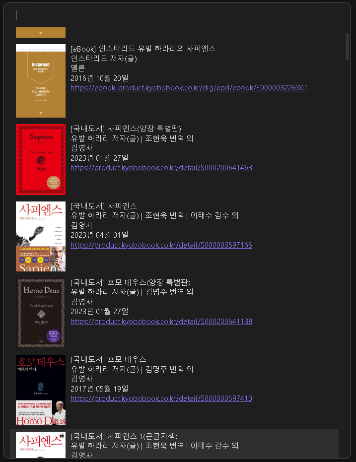 - 그 목록 가운데 찾고 있는 도서를 선택하면 그 정보가 메타 데이터와 본문에 넣어지도록 합니다.