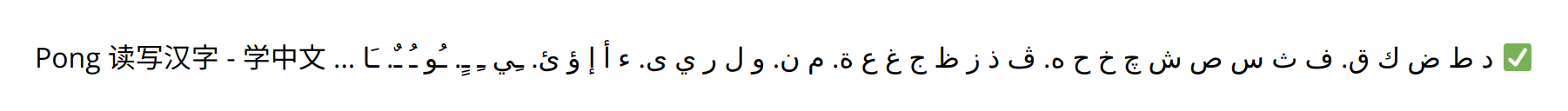 | html += "<div class='ping'>Pong 读写汉字 - 学中文 ... د ط ض ك ق. ف ث س ص ش چ خ ح ه. ڤ ذ ز ظ ج غ ع ة. م ن. و ل ر ي ى. ء أ إ ؤ ئ. ـِي ـِ ـٍ. ـُو ـُ ـٌ. ـَا ✅</</div>" | |