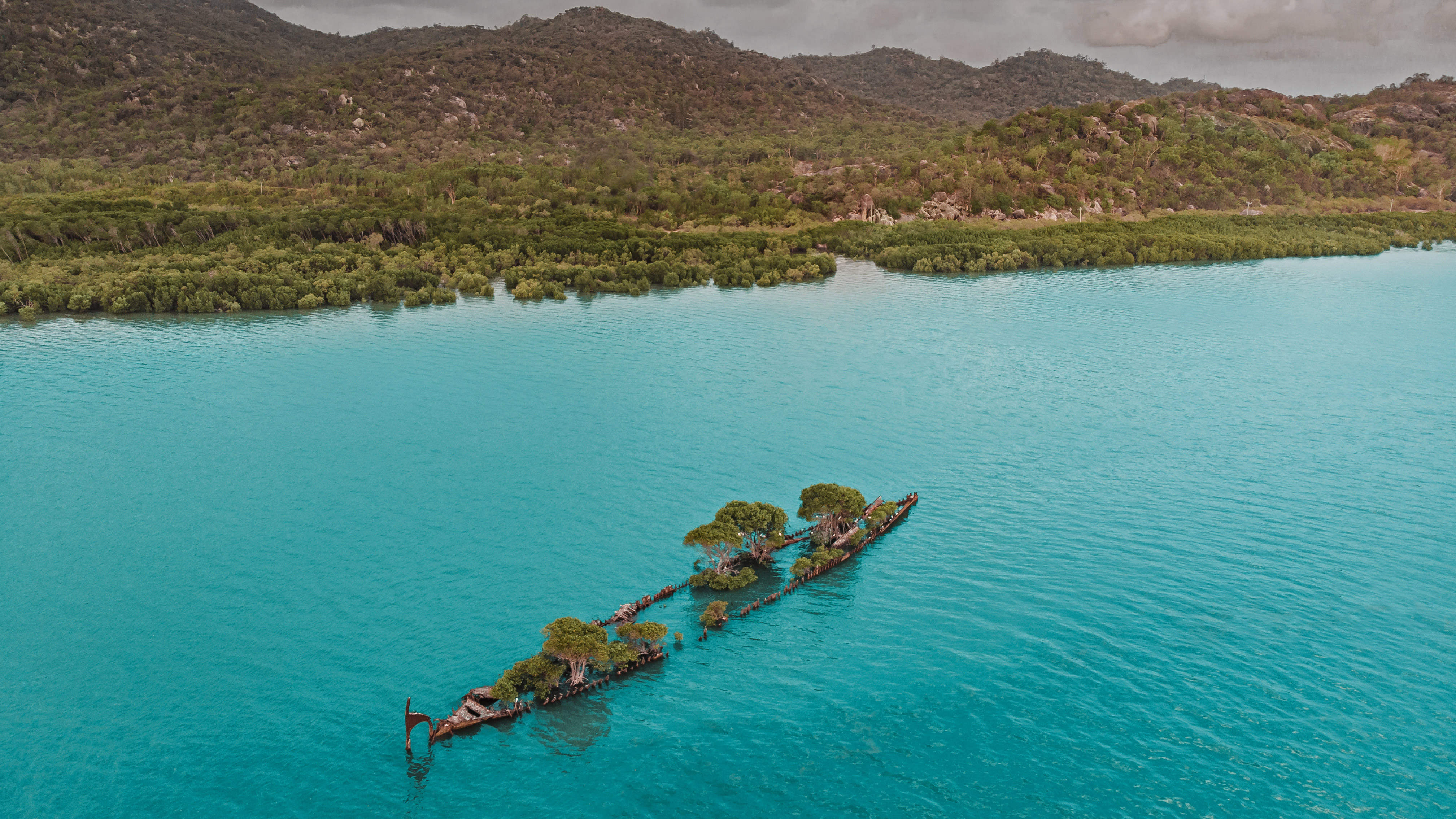 2021-03-20 | Aerial view of the City of Adelaide shipwreck with trees growing on it, Magnetic Island, Queensland, Australia (© Amazing Aerial Agency/Offset by Shutterstock)