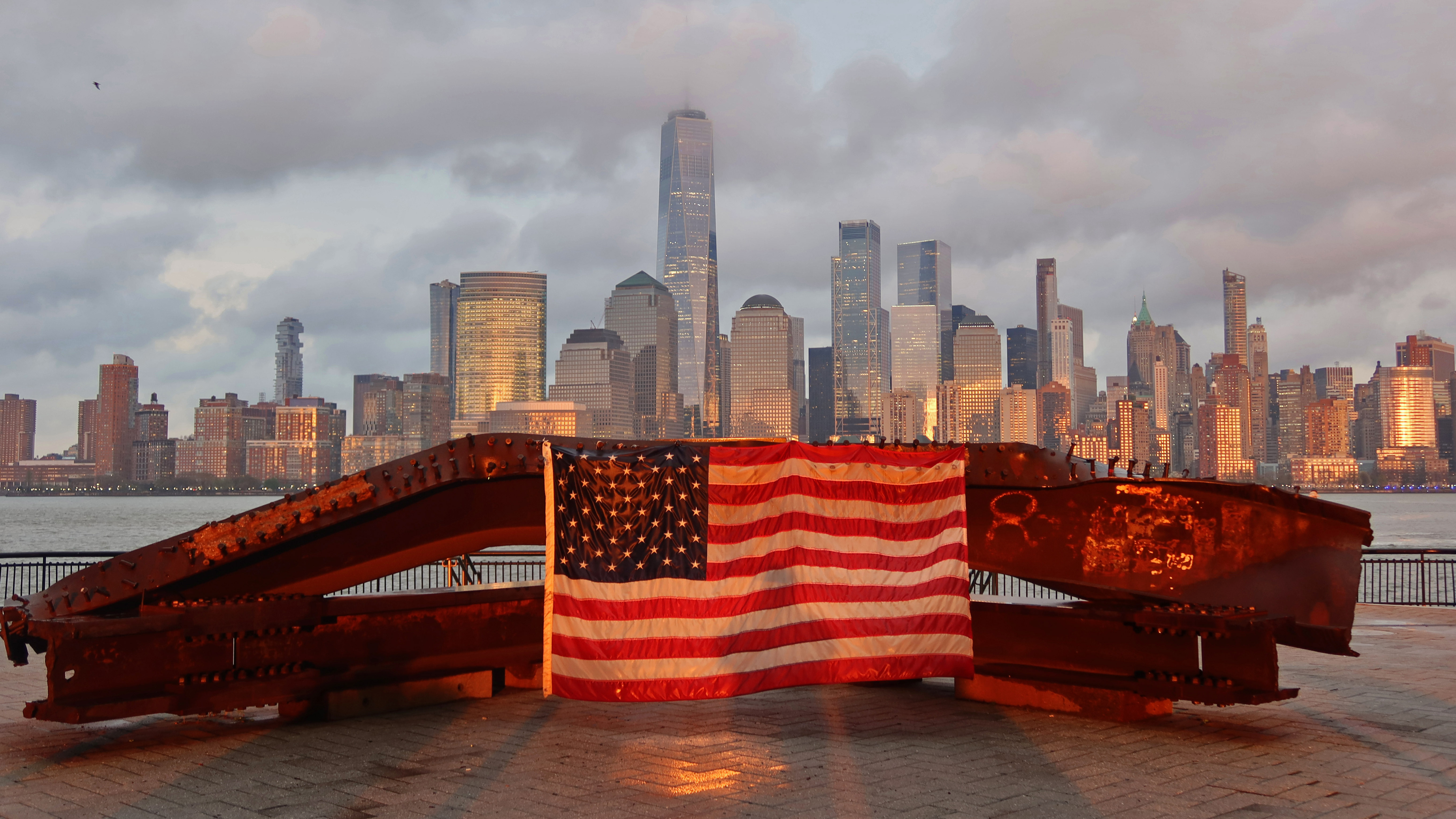 2022-09-12 | Statue of Liberty seen behind US flags at half-staff for the anniversary of September 11 in 2014, New York City (© Adam Parent/Shutterstock)