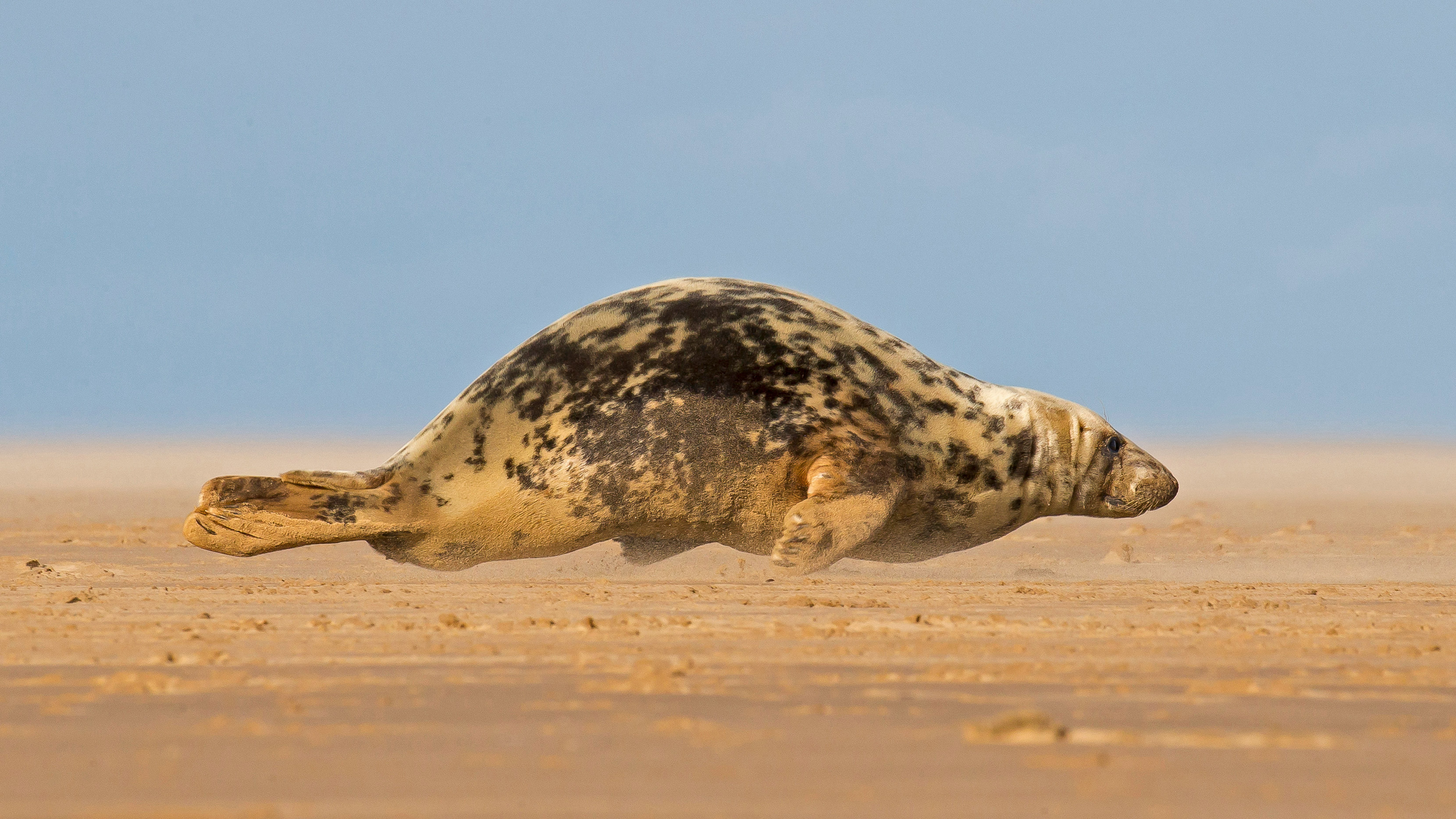 2021-05-05 | Grey seal hitching itself over the beach at Donna Nook, North Lincolnshire, England (© Frederic Desmette/Minden Pictures)