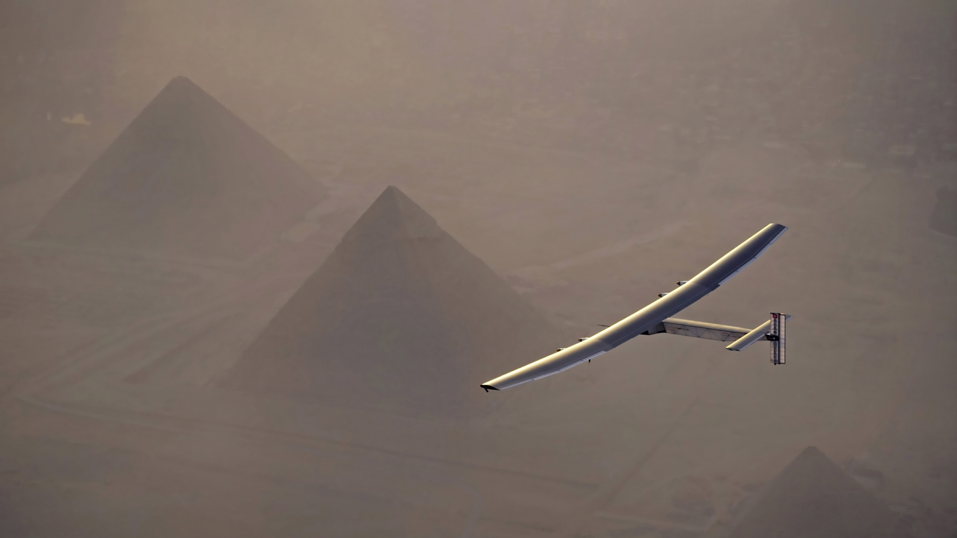 2022-08-20 | Solar Impulse 2 flying over the pyramids in Giza, Egypt (© Jean Revillard/Solar Impulse2 via Getty Images)