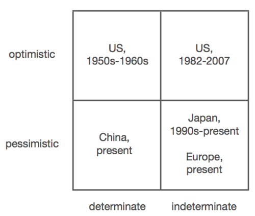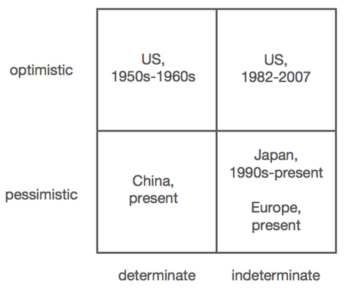 How should one assess industries and opportunities if software is really eating the world? Consider a 2 x 2 matrix. On the vertical axis you have two choices: compete with computers or work with computers. This is essentially anti-technology and pro-technology. On the horizontal axis, your choices are: compete against China or work with China. This essentially corresponds to anti-globalization and pro-globalization.
