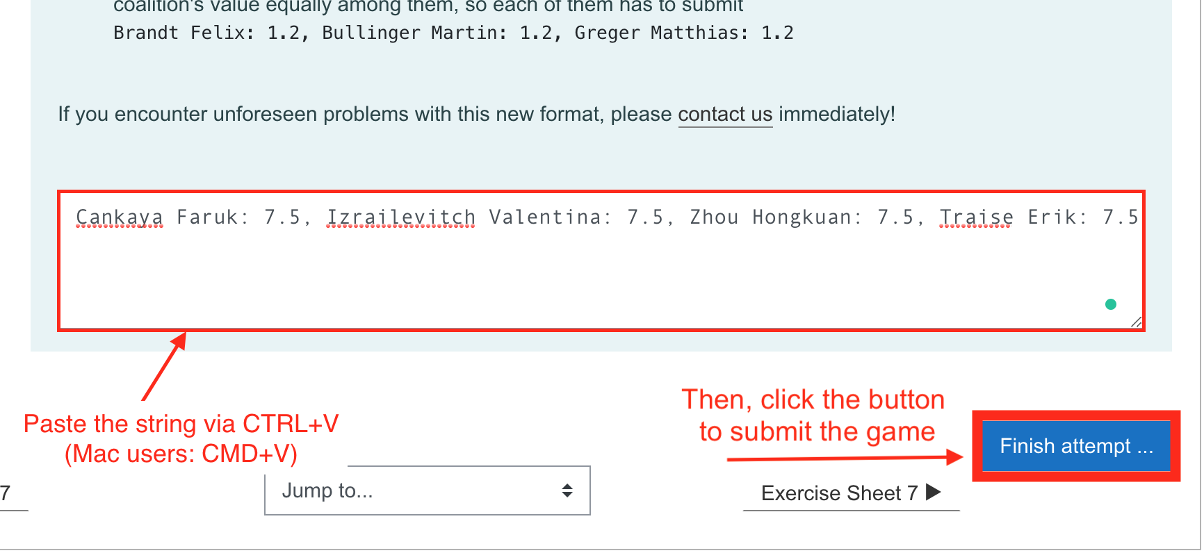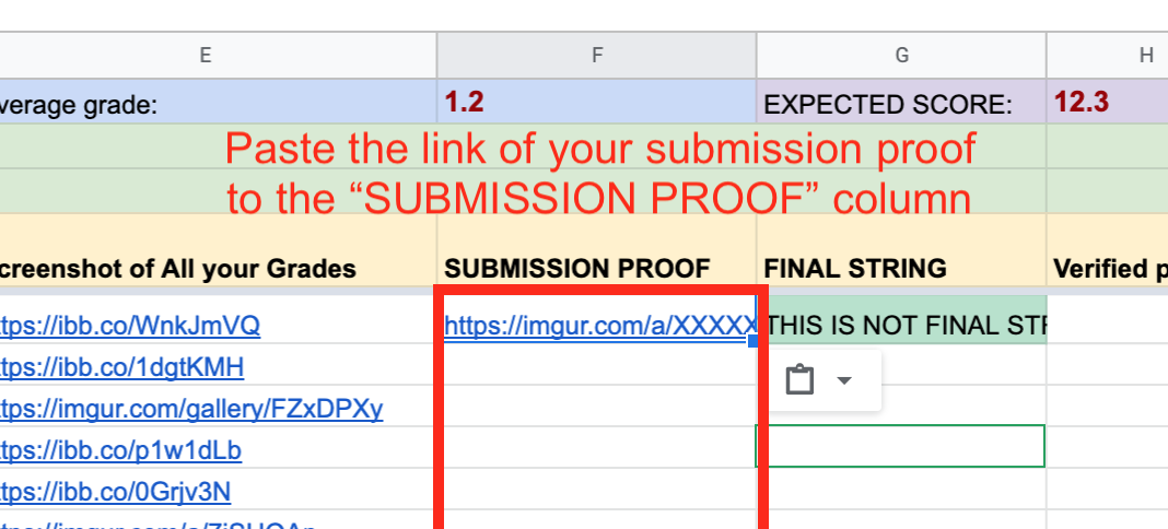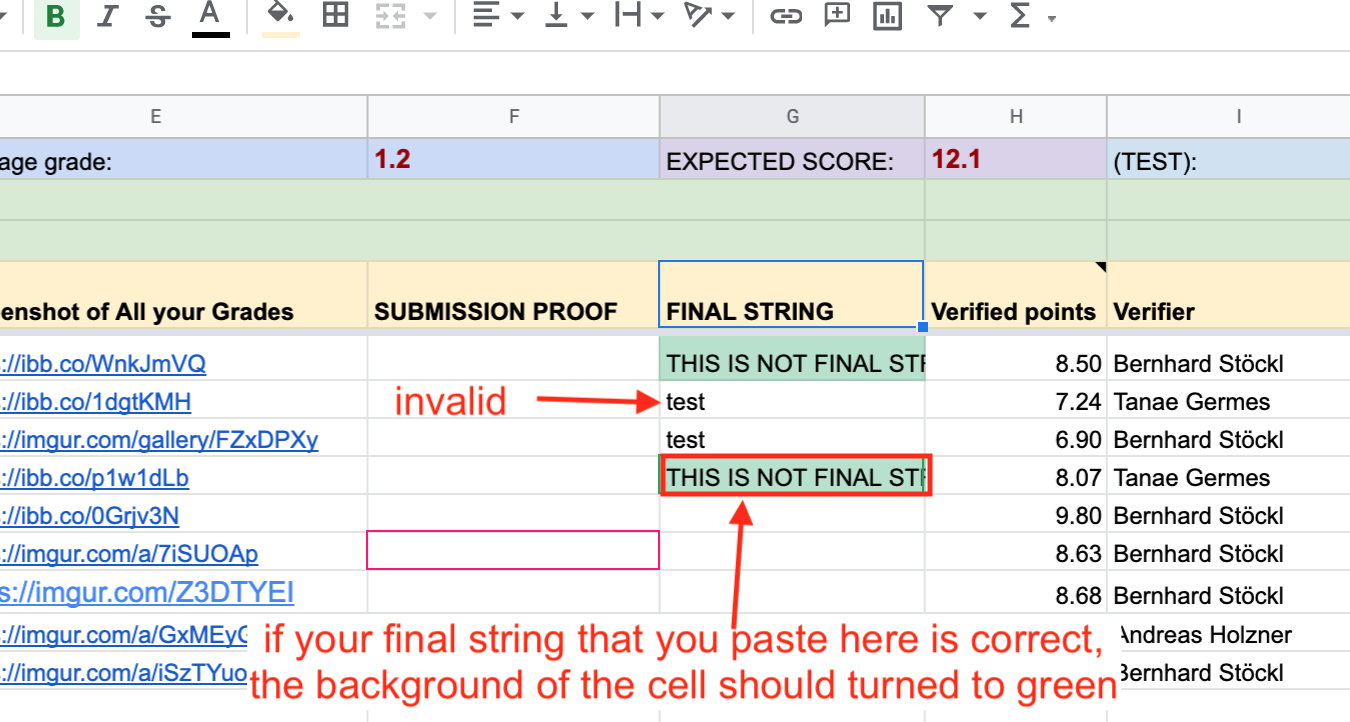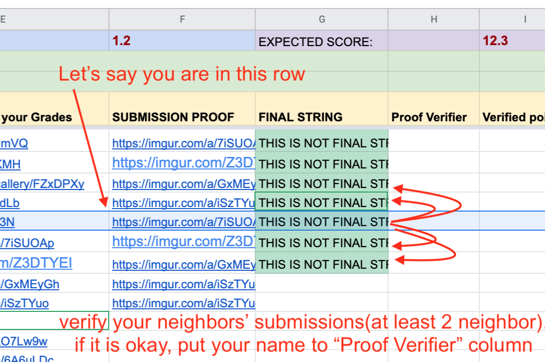 Check at least 2 neighbors next to you if they put the submission proof and the final string they submitted until 20:10. Feel free to send private message to them in the Telegram to make sure they submit the game and put the submission proof to the excel sheet.. Verify the final strings they put are correct. If everyone does this properly and there will not be missing participants, we will be done in the first iteration.