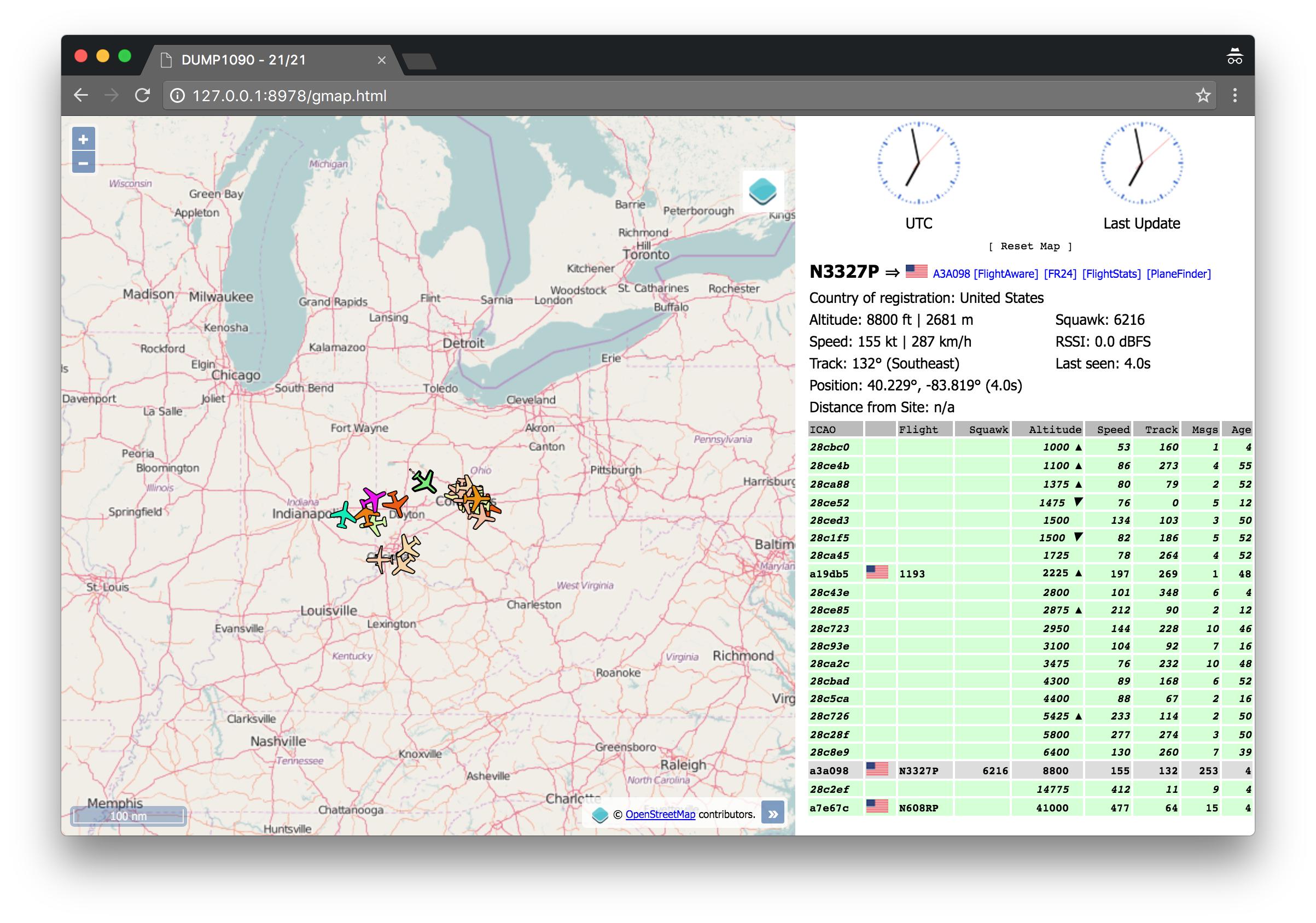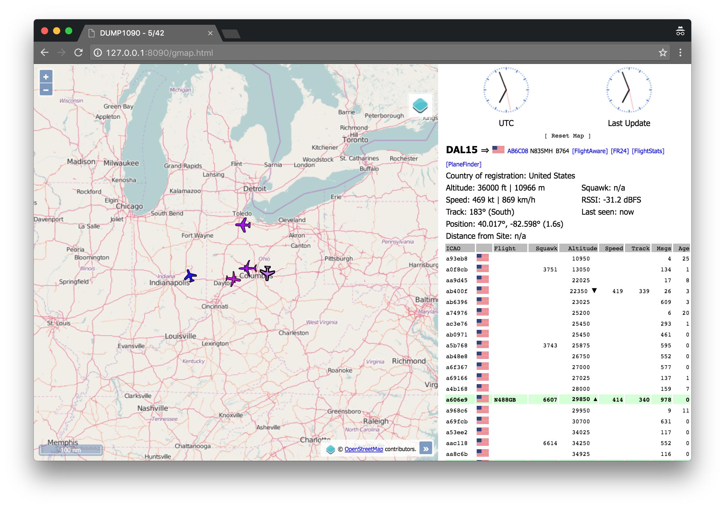 Open a browser tab to http://127.0.0.1:8978/gmap.html to see an OpenStreetMap. Nota bene: both browser windows (dump1090’s and dump978’s) will say “dump1090”, since we just copied dump1090’s webapp and are dumping 978 MHz data into it. The only difference is the port number in the URL.