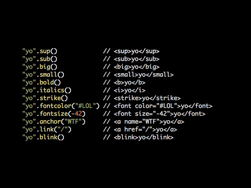Besides the use of String.prototype.fontcolor() this gist features some other nifty tricks, like using bitmasks and exploiting the