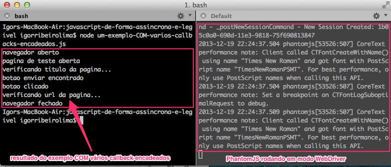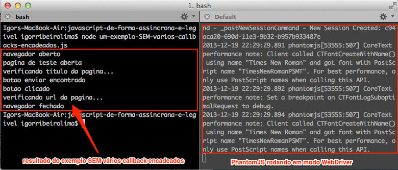Agora vamos criar um outro arquivo sem tantos encadeamentos e executá-lo. Lembre-se que o PhantomJS ainda deve estar rodando em segundo plano. Segue o comando e uma ilustração do resultado obtido: