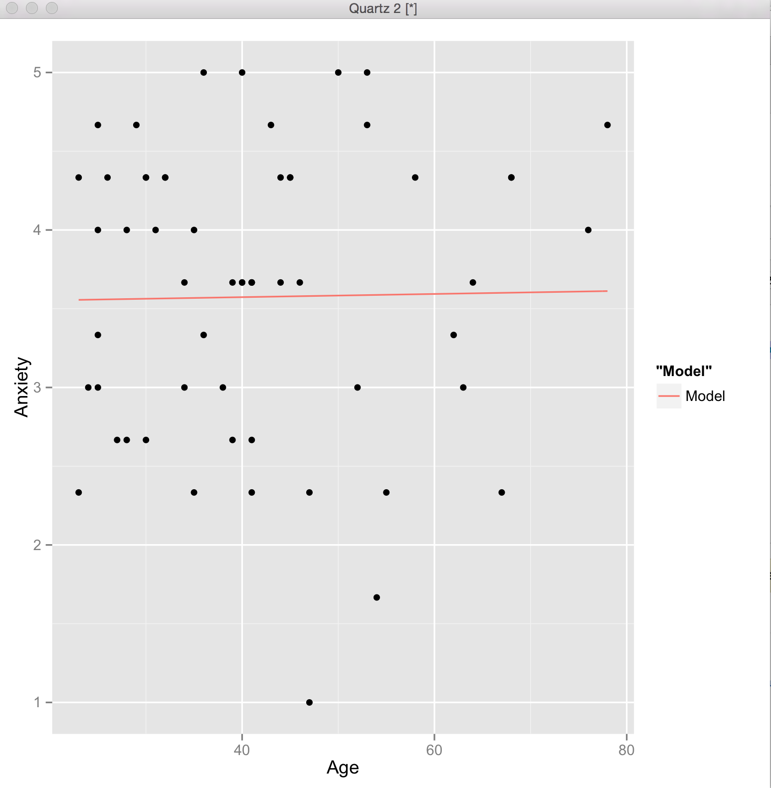 ggplot(AgeAnxietyNoOutliers, aes(x=Age, y=Anxiety)) + stat_function(fun=function(x) 3.533 + 0.001012*x,  geom="line", aes(colour="Model")) + geom_point()