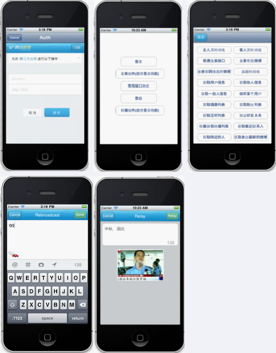 [weiboEngine UICreatRebroadWithContent:@"qq" imageRefURL:@"http://mat1.gtimg.com/app/opent/images/index/iweibo/logo.gif" videoImageRefURL:@"http://www.tudou.com/programs/view/b-4VQLxwoX4" parReserved:nil delegate:self onPostStart:@selector(onPostMsgStart) onPostSuccess:@selector(onPostMsgSucceed:) onPostFailure:@selector(onPostMsgFailed:)];- コールバック