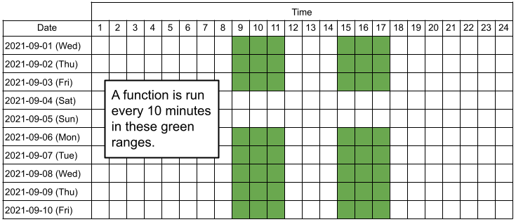 - Execute a function every 10 minutes only in 09:00 - 12:00 and 15:00 - 18:00 for the weekday.