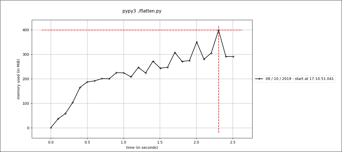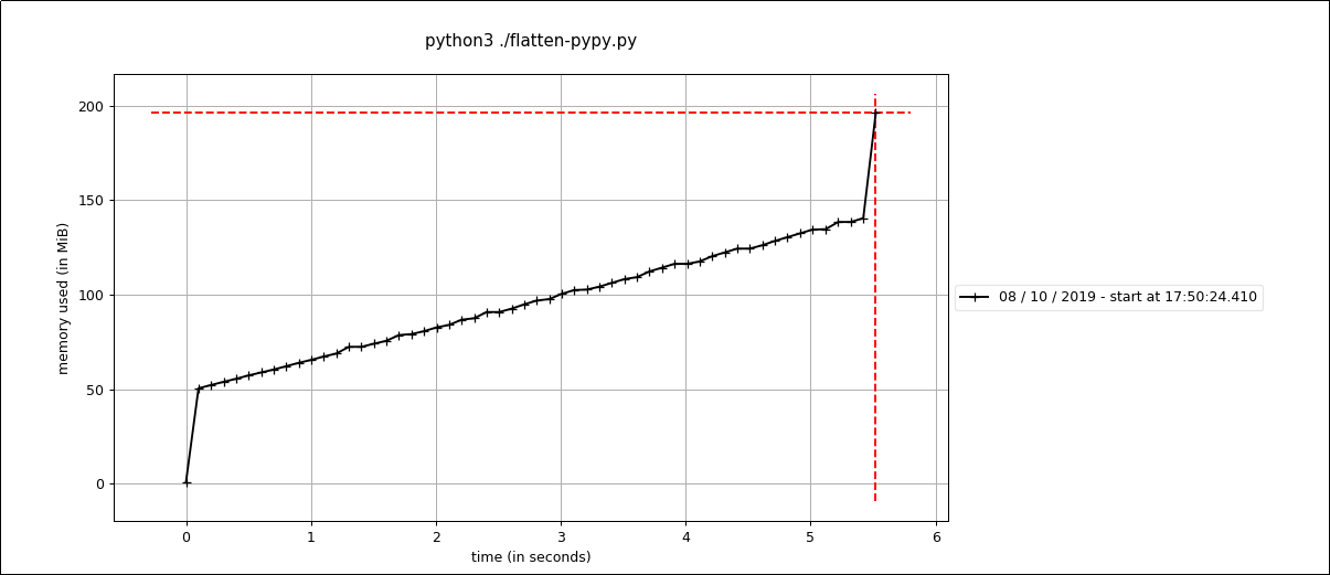 However, when running this revised method under PyPy, it runs almost twice as fast when not using a generator, and uses less memory than the generator variant in pypy: