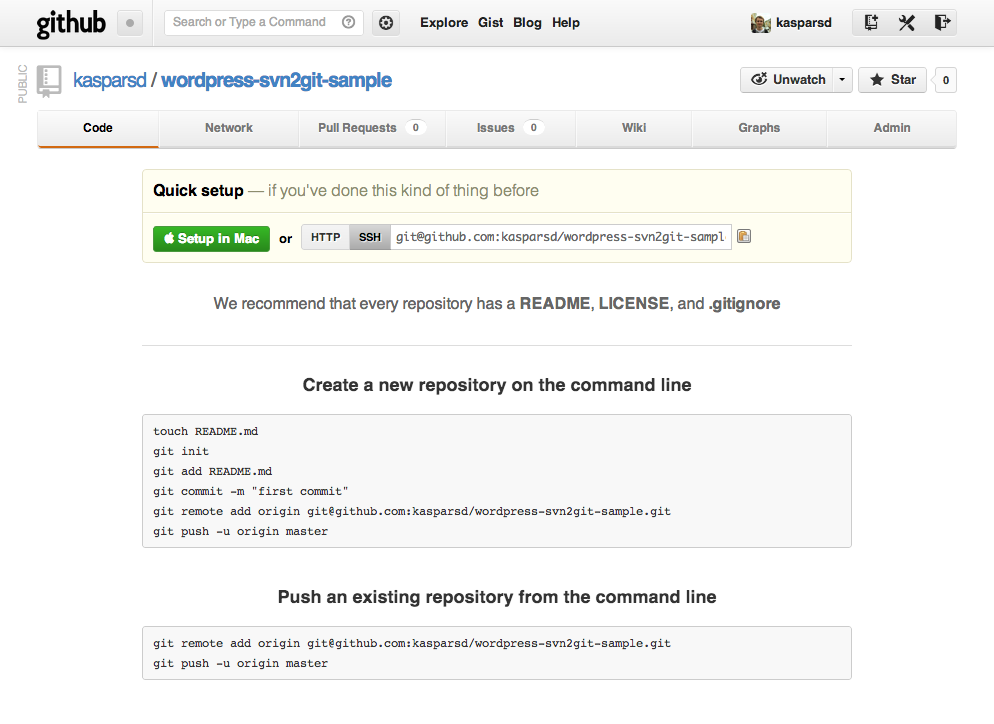$ git remote add origin [email protected]:kasparsd/wordpress-svn2git-sample.git