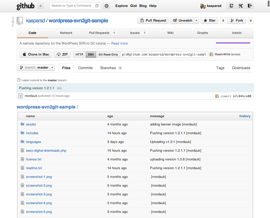 Now your GitHub repository should contain all your plugin files as well as all the revision history carried over from the Subversion repository.