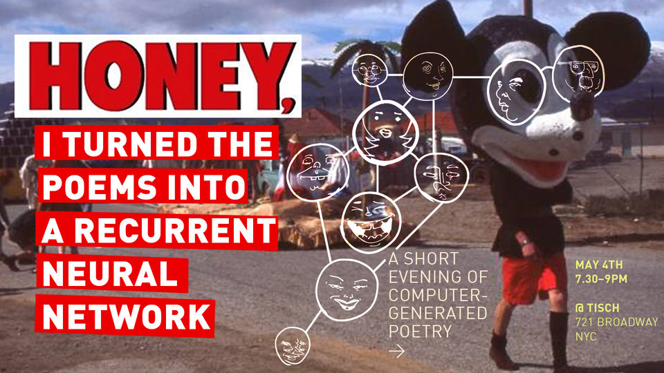 On this auspicious evening, students from NYU's Interactive Telecommunications Program will read their computer-generated poetry aloud before a delighted audience (that's you!). To be presented are a number of vital contemporary poetic forms, including neural network biblical gibberish, PowerPoint presentations from stochastic processes, instructions for generating instructions for generating instructions, deeply plausible computer-imagined artist statements, human-assisted machine translations, and oh, chatbots of all types and varieties.