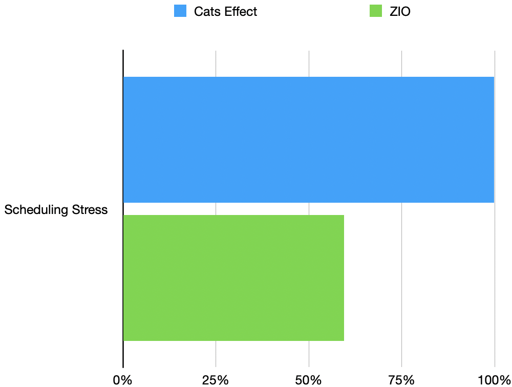 The reason for the difference between Cats Effect and ZIO on this test comes from the contention points within the work-stealing scheduler itself. Cats Effect's runtime has been very aggressively optimized to remove contention points between worker threads, ensuring that the overhead of scheduling is almost entirely eliminated. This is one area in which Cats Effect has advanced the state of the art considerably relative to older designs (like Tokio's work-stealing runtime, or the ForkJoinPool in the Java Standard Library), which generally put a considerable amount of load on singular contention points during stealing and local queue overflow, among other cases.