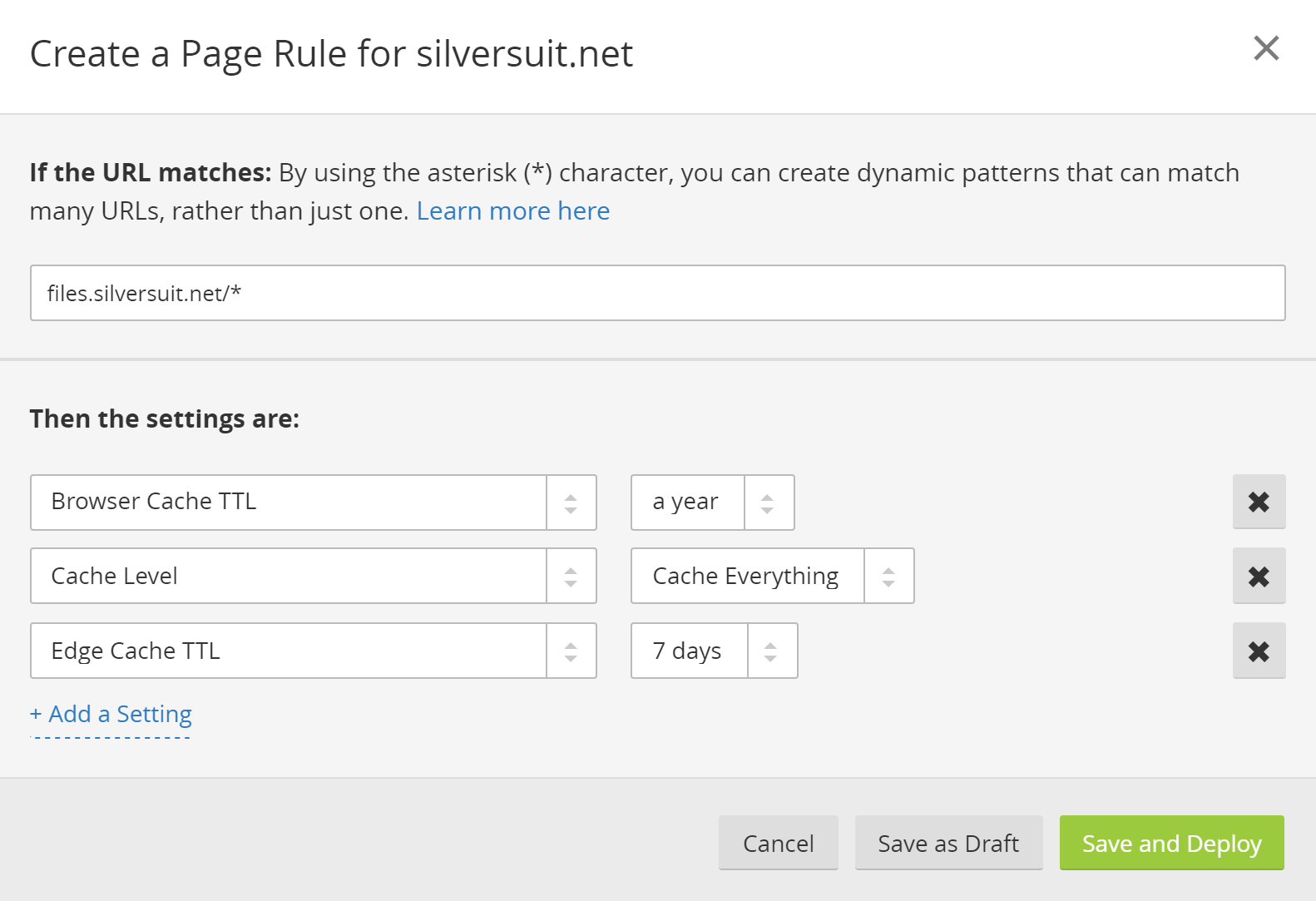 You then need to add your cache settings. I have Cache Level set to Cache Everything; Browser Cache TTL set to a year; Edge Cache TTL set to 7 days. I'm caching aggressively here, but you can tweak these settings to suit. Here's a screenshot: