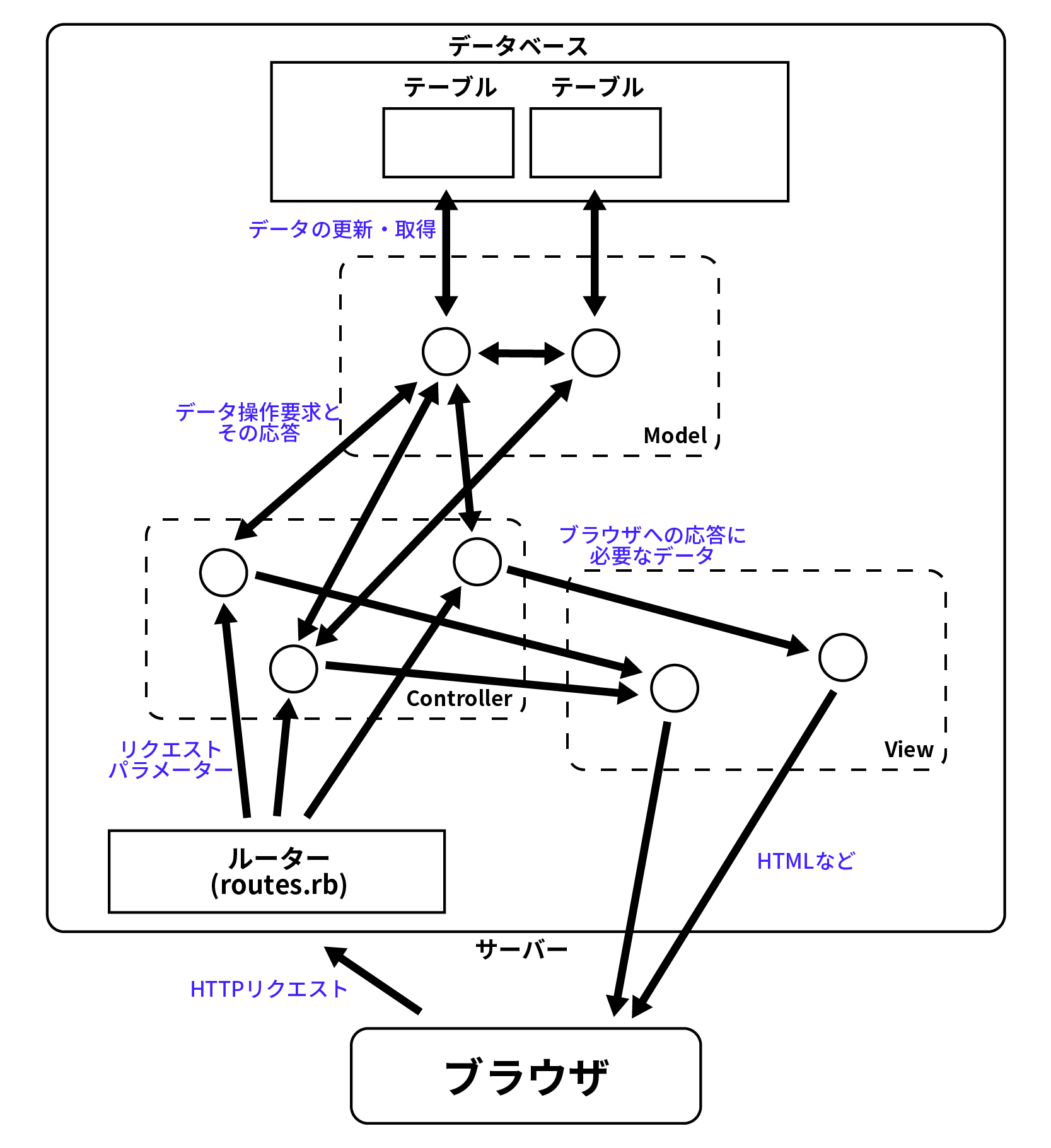 - Model: アプリケーションが扱う「モノ」や「コト」と、それに対する操作を表現したもの。典型的な設計ではデータベースのテーブルと同じ数だけ存在する。