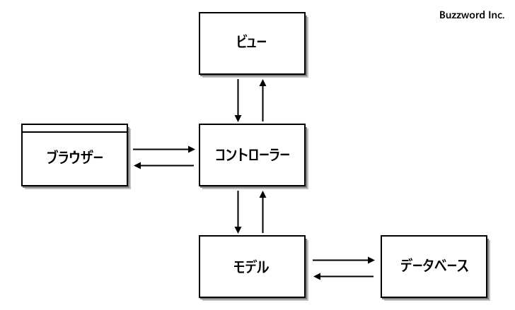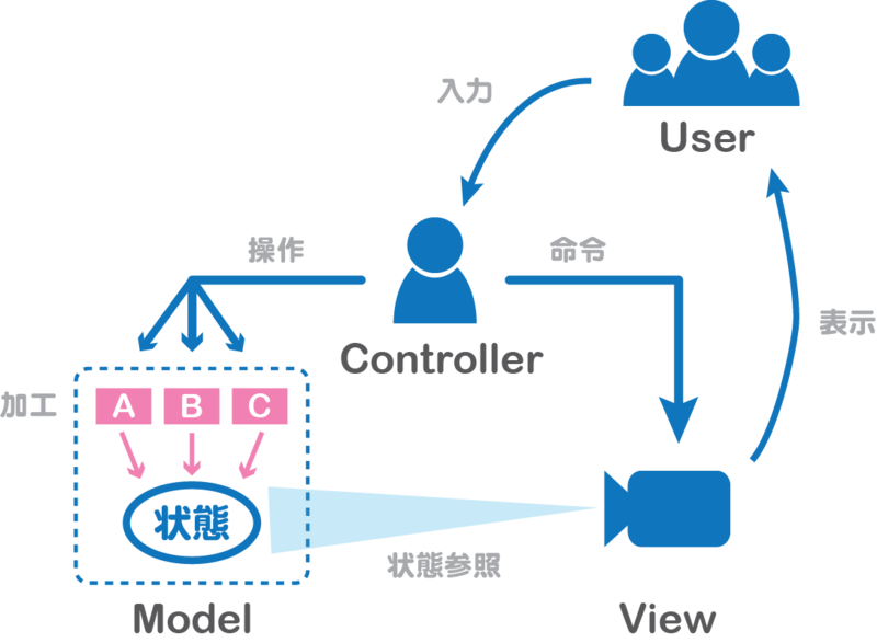 - Controller: 入力(HTTPリクエスト)を受け取り、それに対して必要な操作をModelを通して実行し、その結果をViewに渡す。