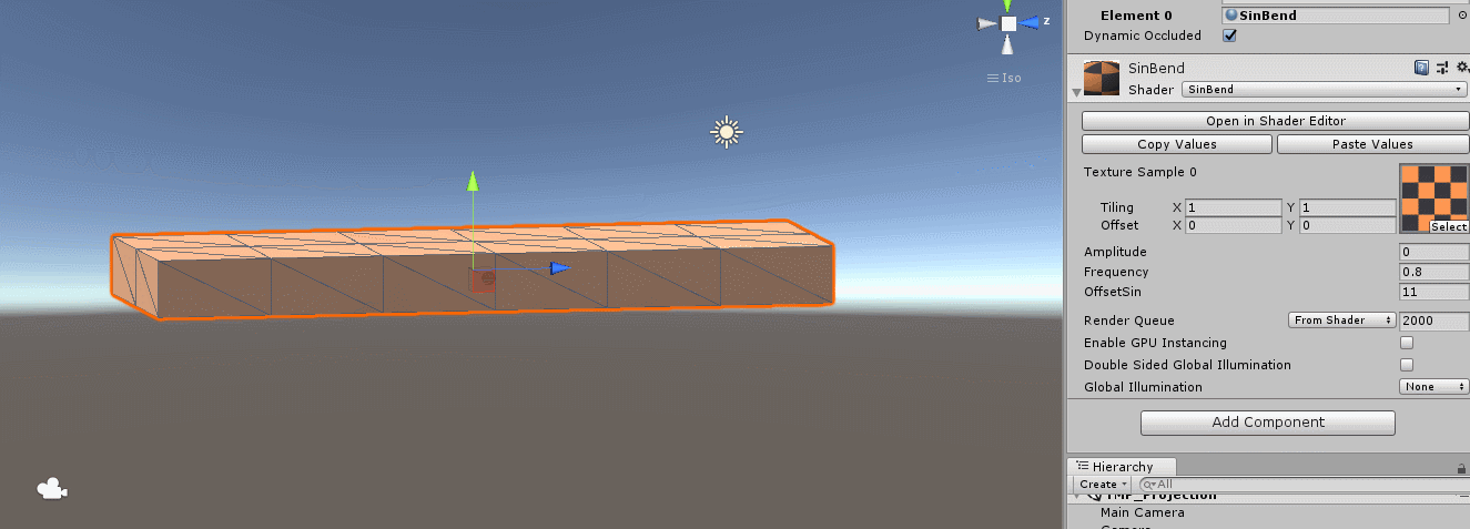 float4 result = (float4(0.0 , ( sin( ( _OffsetSin + ( vertexPos.x * _Frequency ) ) ) * _Amplitude ) , 0.0 , 0.0));The more vertices your mesh has along the axis you want to bend the smoother it will look. Tested with Unity 2018.2