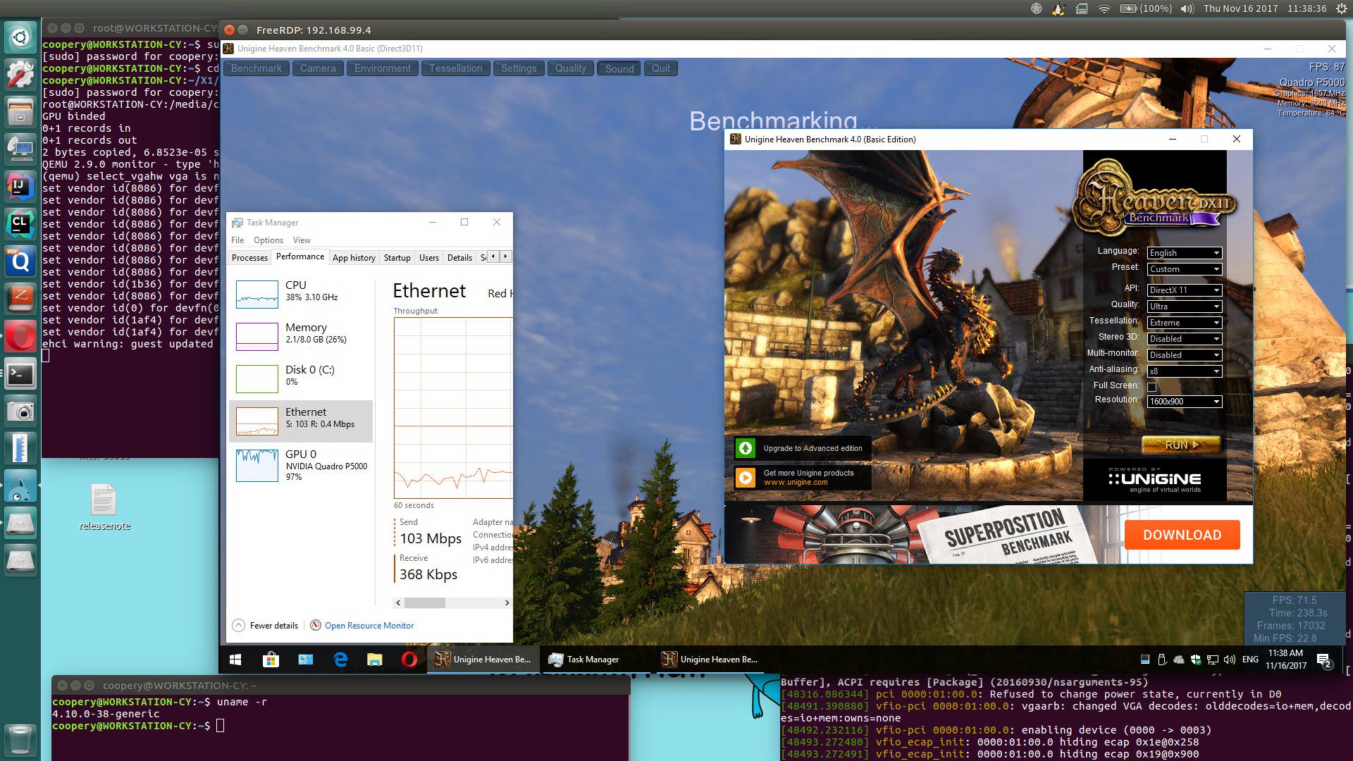 - Fire up a benchmark like Unigine Heaven in the VM, check if your dGPU can maintain a higher than 90~95% utility stably. If not, tune down your resolution and try again. You will find a sweet spot that suits your hardware.