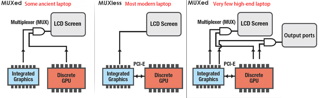 Now for switchable graphics, there are three different solutions: MUXed(Old), MUXless and MUXed(New)