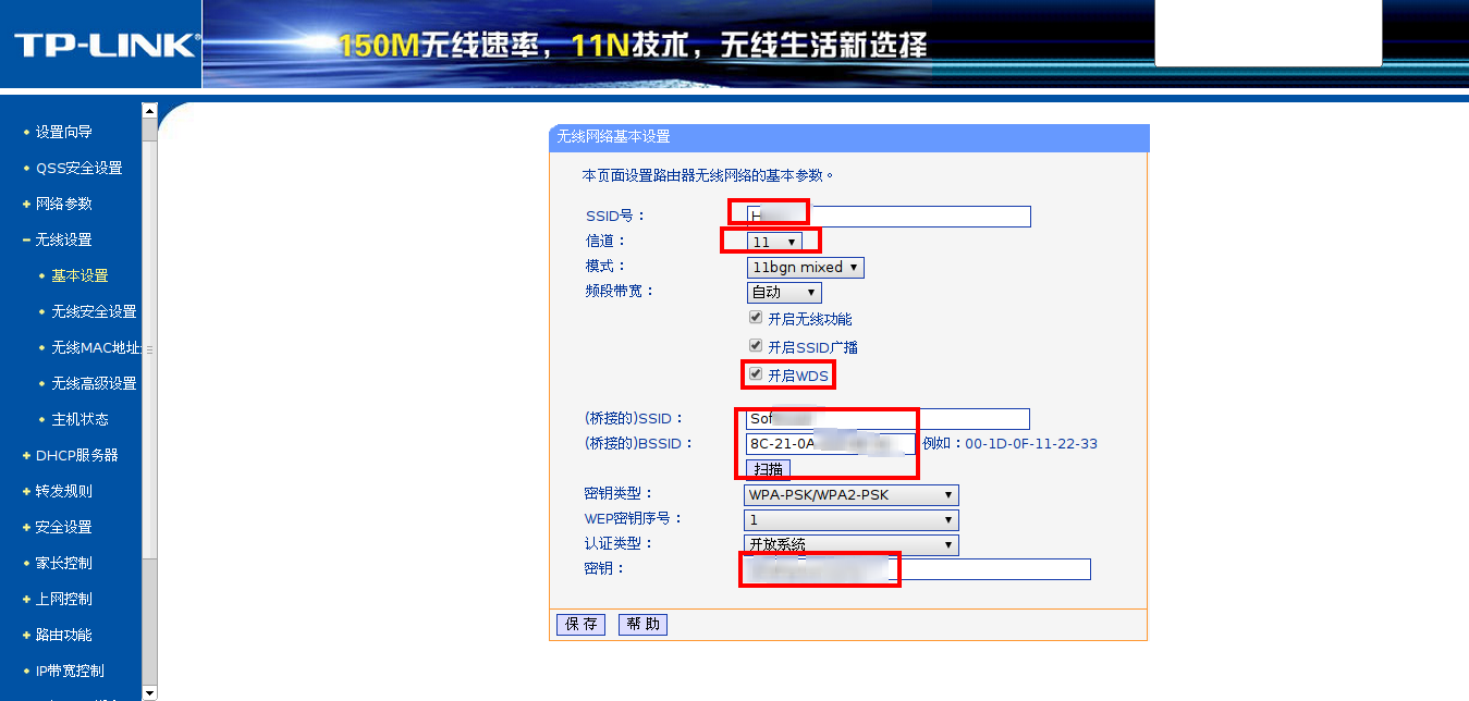 开启WDS功能, 扫描目标路由. 找到你的目标, 选14:E6:E4:31:8E:F2加密方式, 填密码, 具体如下图.