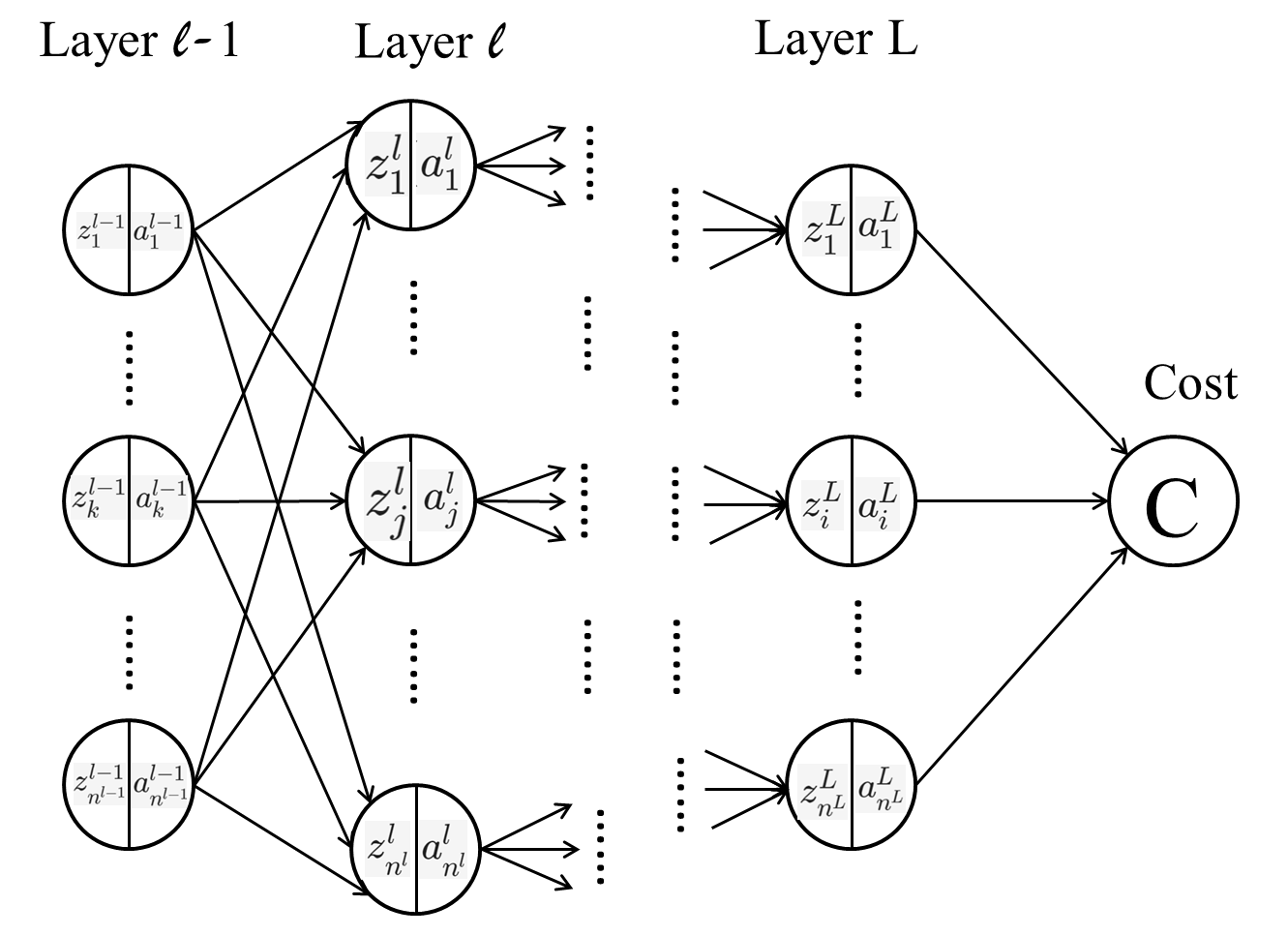 z_{j}^{l} &= \sum_{k=1}^{n^{l-1}} w_{jk}^{l} \times a_{k}^{l-1}+b_j^{l} \