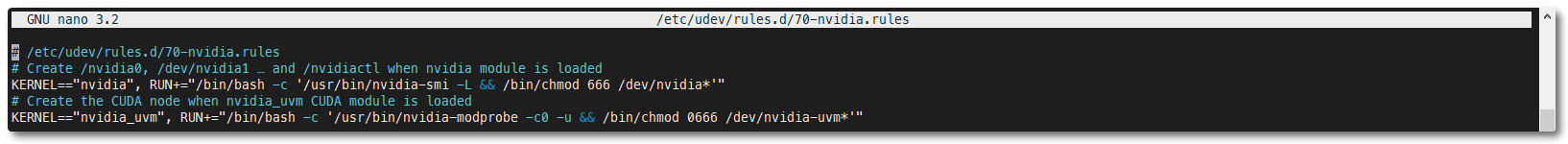 KERNEL=="nvidia", RUN+="/bin/bash -c '/usr/bin/nvidia-smi -L && /bin/chmod 666 /dev/nvidia*'"